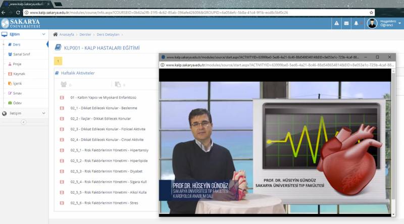 Sağlık Bakanlığı Sakarya Üniversitesi Eğitim ve Araştırma Hastanesi Kardiyoloji Kliniği'ninden taburcu olan hastalar, kalp hastalığı ve sonrasında yapılması gerekenler hakkında tüm bireylerde farkındalık oluşturmak için Sakarya Üniversitesi Uzaktan Eğitim Araştırma ve Uygulama Merkezi'nde Tıp Fakültesi öğretim üyeleri tarafından sunumları ve içerik çekimleri gerçekleştirilen "İlk Kalp Krizi Sonrası" eğitim modüllerine Kalp Hastaları Uzaktan Eğitim Portalı'ndan ulaşabilirsiniz.