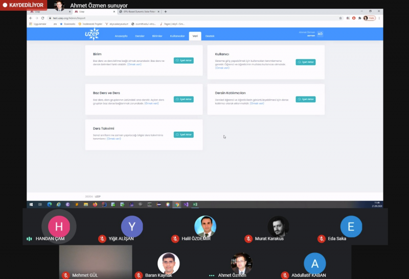UZEP Uzaktan Eğitim Platformunu kullanacak üniversitelerin yer aldığı eğitim seminerinde proje yürütücüsü Sakarya Üniversitesi Bilgisayar Araştırma ve Uygulama Merkezi (BAUM) Müdürü Prof.Dr. Ahmet Özmen, Sakarya Üniversitesi Uzaktan Eğitim Araştırma ve Uygulama Merkezi (UZEM) Müdürü Prof.Dr. Mehmet Barış Horzum ve proje ekibi, UZEP Uzaktan Eğitim Platformunun tanıtımını yaparak, veri yükleme ve öğretim materyalleri paylaşımı gibi konularda sunum ve bilgi alışverişinde bulundular.